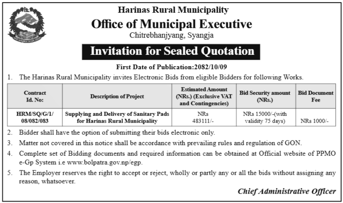 Invitation for Bid: Supplying and Delivery of Sanatory Pads for Harinas Rural Municipality.
