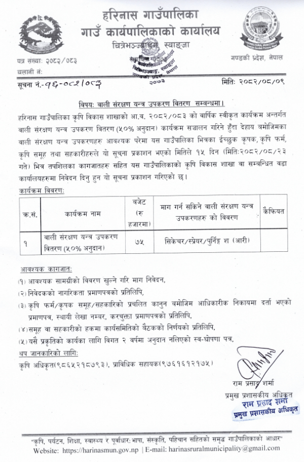 वालि संरक्षण यन्त्र उपकरण वितरण सम्बन्धमा।